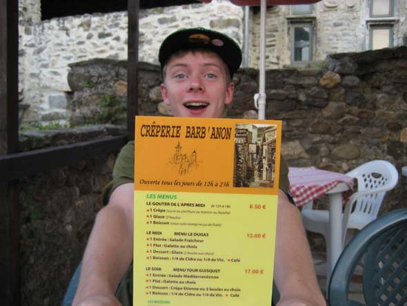We hadden bedoeling om naar het dorp te gaan om Crêpes te gaan eten bij het restaurantje boven aan de berg, maar onze wandeltocht naar boven bleek helemaal voor niets te zijn geweest omdat deze gesloten was. We hebben nog wel rond gekeken of er nog iets anders open was waar je kon gaan eten, eerste suggestie was de pizzabus die bij parkeerplaats staat. Maar doordat het van die karige pizza’s waren en de borden waren in het Frans hadden we toch besloten om door te lopen en kijken of er meer te vinden was. Helaas was het niet veel soeps in het dorp.