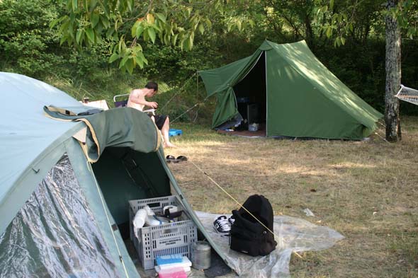 Na een niet zo heel lange rit eindelijk bij de camping aangekomen en de tent maar eens opgezet zodat we konden slapen. En wat heeft Alexander vergeten? Juist een hamer… moesten we de haringen met uitjes met de hand erin drukken.